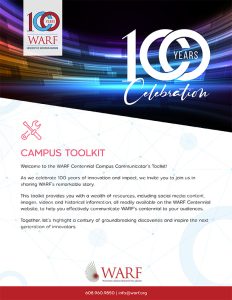 This toolkit provides you with a wealth of resources, including social media content, images, videos and historical information, all readily available on the WARF Centennial website, to help you effectively communicate WARF’s centennial to your audiences.